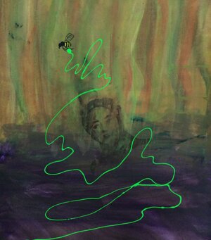 LAST BEE TAKING A GREEN DOT FOR FINAL EXPLORATION - 21 JULY 2021 06_08 pm DEDICATED TO ELENA COLOMBO MURDERED IN AUSCHWITZ AT ONLY 11 YEARS OF AGE IN 1944 cm 70 x 100